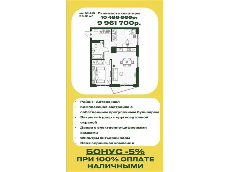 9 961 700 р. (181 089 р./м2) Подать заявку на ипотеку |