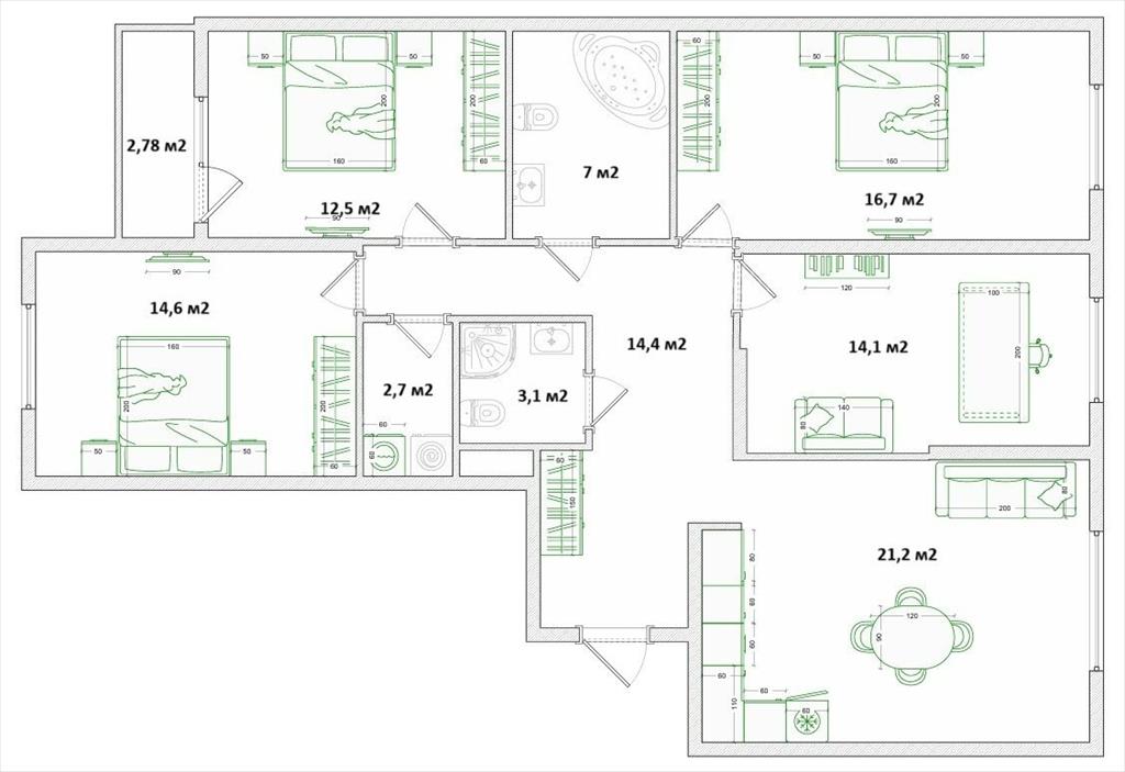 общая 105,2 м2, жилая 58 м2, кухни 21 м2 |
