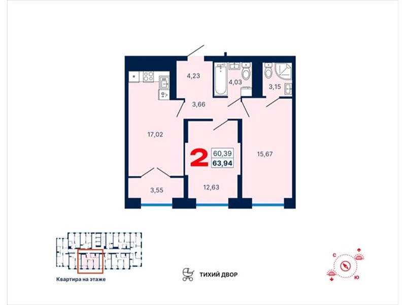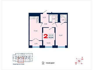 общая 63,94 м2, жилая 28,3 м2, кухни 17,02 м2 |
