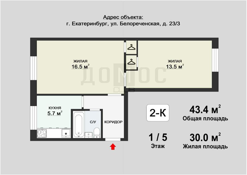 | Двухкомнатная квартира по ул. ул. Белореченская, 23/3 в Екатеринбурге |