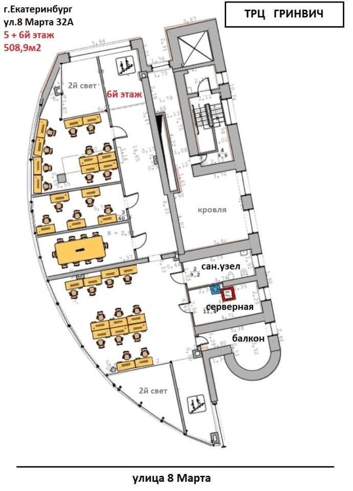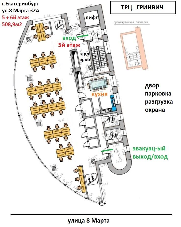 | Предлагаются в долгосрочную аренду универсальные, Высокодоходные,<br />Торгово - Офисные помещения в самом центре г. Екатеринбурга !<br />ул. 8 Марта 32А, возле известного ТРЦ Гринвич.<br />_____________________________________________ ____________________<br />АДРЕС :<br />Россия, Свердловская область, г.Екатеринбург, ул.8 Марта, дом 32А<br />----------------<br />СВОБОДНОЕ ПОМЕЩЕНИЕ :<br />5 + 6й этаж 508,9 м2 (совмещены внутренней лестницей)<br />- ПОМЕЩЕНИЕ НЕ РАЗДЕЛИТЬ<br />- В помещении сделан дорогой, современный, качественный ремонт<br />- Высота потолков 3 метра<br />- Интернет (два провайдера), городской телефон<br />- Все остальные помещения в этом здании уже заняты,<br />арендаторы очень довольны, успевайте и Вы !<br />-------------------------------<br />ЗДАНИЕ :<br />- Центральное водоснабжение (ХВС, ГВС), водоотведение<br />- Электрическая мощность 30 кВт<br />- Система приточно-вытяжной вентиляции и кондиционирования<br />- Спринклерная система пожаротушения<br />- Охранная сигнализация<br />- Парковка во дворе здания, на улице, в ТРЦ Гринвич, в Бизнес Центрах<br />- Панорамное остекление. Современный дизайн, ремонт<br />- Ваша реклама на фасаде здания<br />-------------------------------<br />РАЙОН :<br />- Центральный, самая развитая инфраструктура города, очень престижное место !<br />- Большой пешеходный и автомобильный трафик - каждый день !<br />- Рядом : ТРЦ Гринвич, Метро станция Геологическая, Цирк, Дендропарк, Площадь 1905г,<br />Администрация города, Бизнес-центры, Образовательные учреждения, и многое другое.<br />-------------------------------<br />ПАРКОВКА АВТО :<br />1. Во дворе здания, 1-2 места по договору<br />(парковка ограничена, рассчитана на 3 здания)<br />2. В ТРЦ Гринвич (напротив)<br />- Западный ул.Вайнера (этажерка) Бесплатно 8 часов<br />- Восточный ул.8 марта (этажерка) Бесплатно 5 часов<br />- Южный и центральный (подземный) Бесплатно 3ч будни / 2ч выходные<br />- Северный ул.Радищева (подземный) Бесплатно 4 часа<br />3. На прилегающей территории (фото - парковка)<br />-------------------------------<br />Просмотр в любое удобное время, по предварительной договоренности.