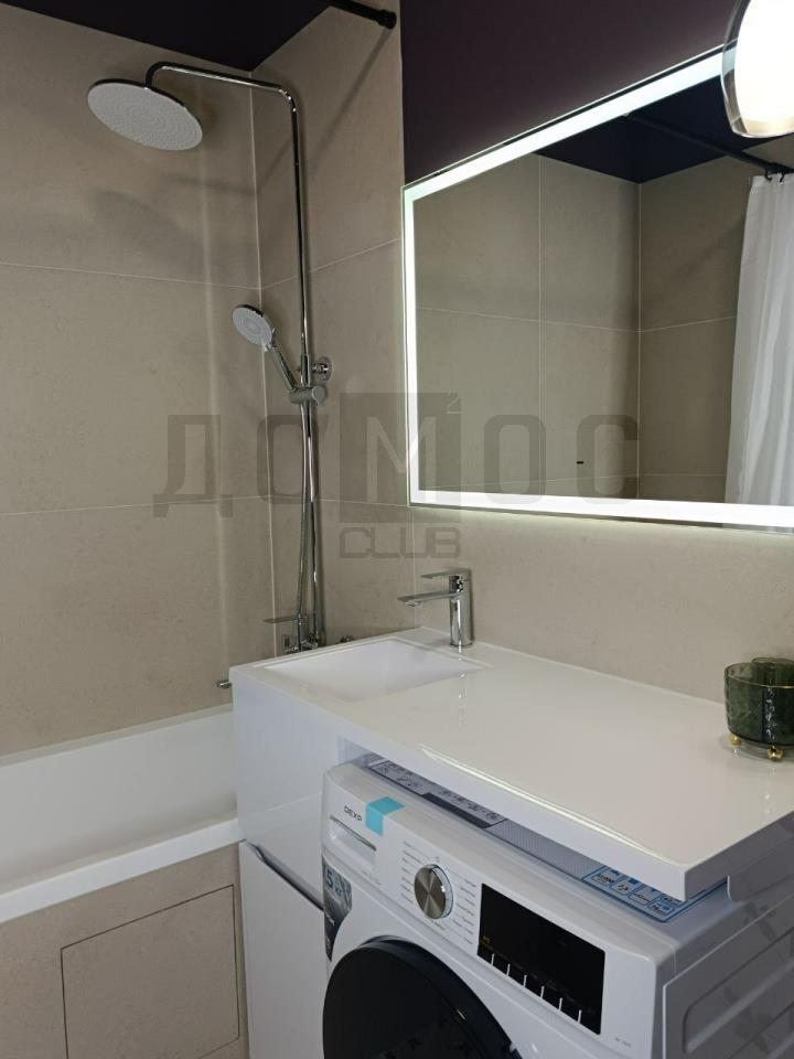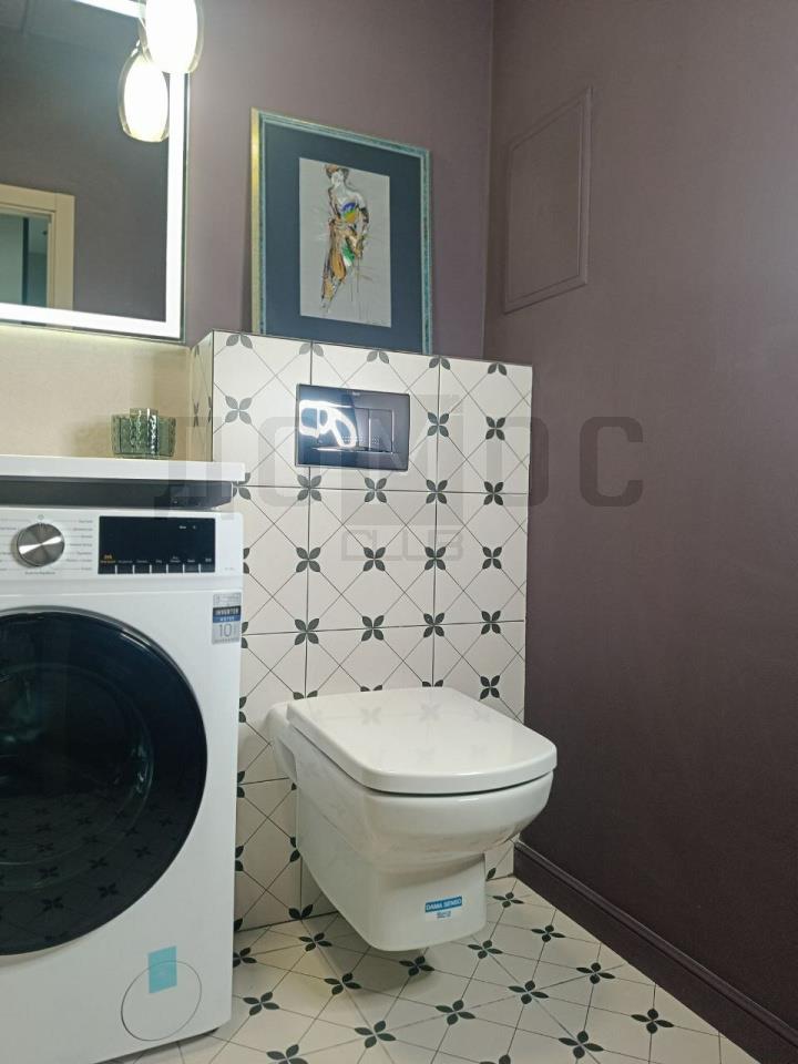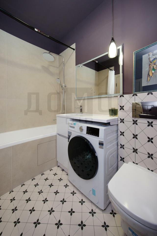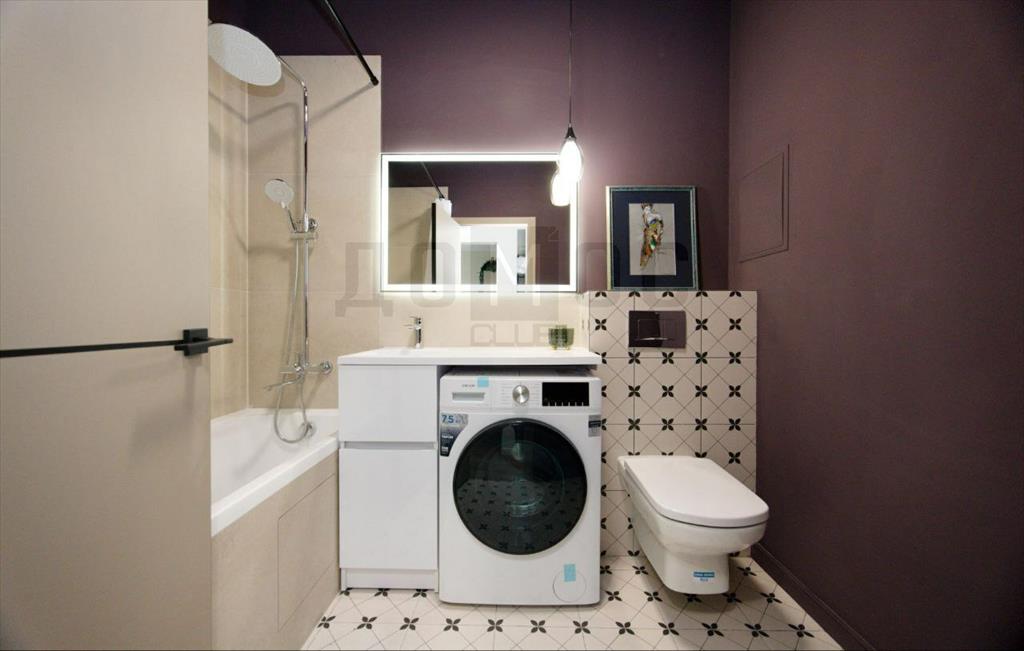 <li><b></b><b >Ванная комната:</b>Отделана с особым вкусом. Глубокий сливовый акцент, стильная плитка с геометрическим принтом, современная сантехника и зеркало с подсветкой превращают утренние сборы в ритуал. Стиральная машина эргономично встроена в гарнитур.</li>