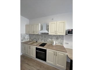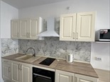 <li>Кухня-го стиная: современный кухонный гарнитур, электрическая варочная панель и духовой шкаф (Indesit), вытяжка (Weissgauff), холодильник Indesit No Frost, микроволновая печь, чайник, обеденный стол и 3 стула. Есть удобный диван-еврокнижка, телевизор.</li>